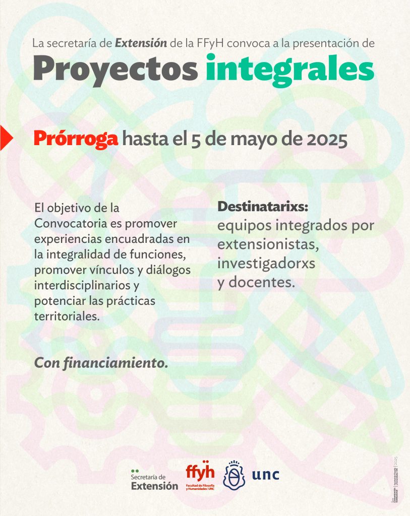 La Secretaría de Extensión de la FFyH informa que se extendió hasta el 5 de mayo el plazo para la presentación de proyectos para la 3º Convocatoria a proyectos integrales, cuyo objetivo es promover experiencias encuadradas en la integralidad de funciones, fomentar vínculos y diálogos interdisciplinarios y potenciar las prácticas territoriales.