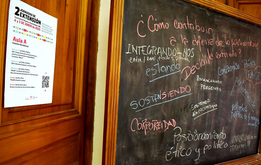 Llevar adelante las jornadas exige el trabajo mancomunado de muchísimas personas: de la comisión organizadora, de coordinadorxs de mesas y talleres; de extensionistas, estudiantes, docentes y graduadxs que participaron de esas mesas y talleres, del personal nodocente de servicios generales, del área de tecnología educativa, de prensa, de mantenimiento, del museo de antropologías; del CAEFFyH; de invitadxs que viajaron para compartir con nosotrxs sus experiencias y saberes.