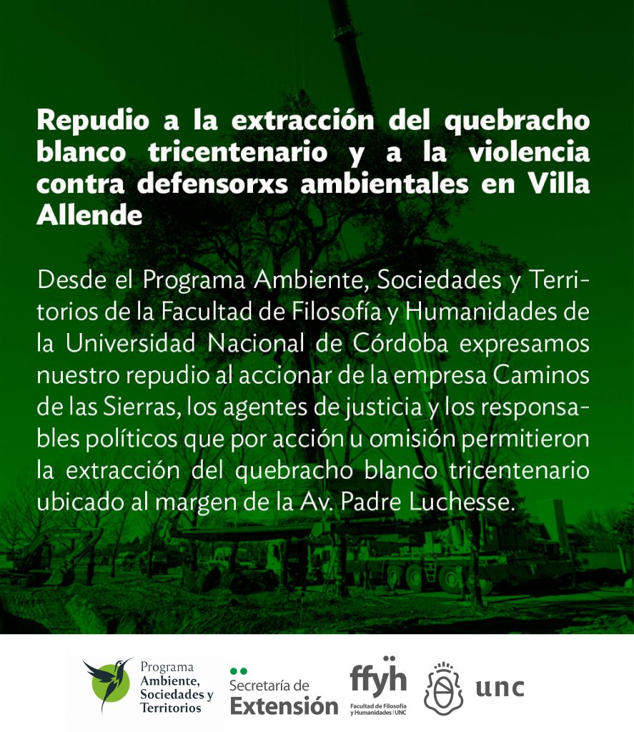 Desde el Programa Ambiente, Sociedades y Territorios de la Facultad de Filosofía y Humanidades de la Universidad Nacional de Córdoba expresamos nuestro repudio al accionar de la empresa Caminos de las Sierras, los agentes de justicia y los responsables políticos que por acción u omisión permitieron la extracción del quebracho blanco tricentenario ubicado al margen de la Av. Padre Luchesse.