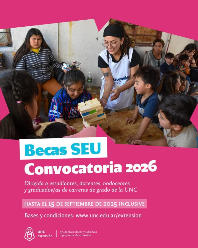 La Secretaría de Extensión Universitaria (UNC) informa que hasta el 16 de septiembre de 2024 inclusive se encuentra abierta la Convocatoria Becas SEU para realizarse durante 2025. Se llama a la presentación de proyectos que vinculen a la Universidad con el medio, potenciando el trabajo que docentes, graduados, nodocentes y estudiantes realizan desde la UNC junto con y para la sociedad.