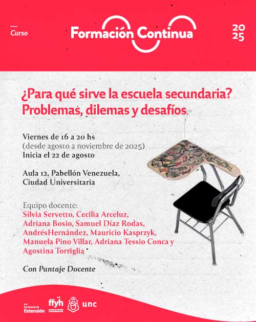 Destinataries: Estudiantes de Institutos Superiores de Formación Docente de Profesorados de Educación Primaria e Inicial. Estudiantes de Profesorados de la UNC. Educadores populares o participantes de espacios educativos, territoriales que trabajen con niñxs y jóvenes. Docentes de todos los niveles del sistema educativo. Miembres de Programas y proyectos extensionistas de la FFyH.