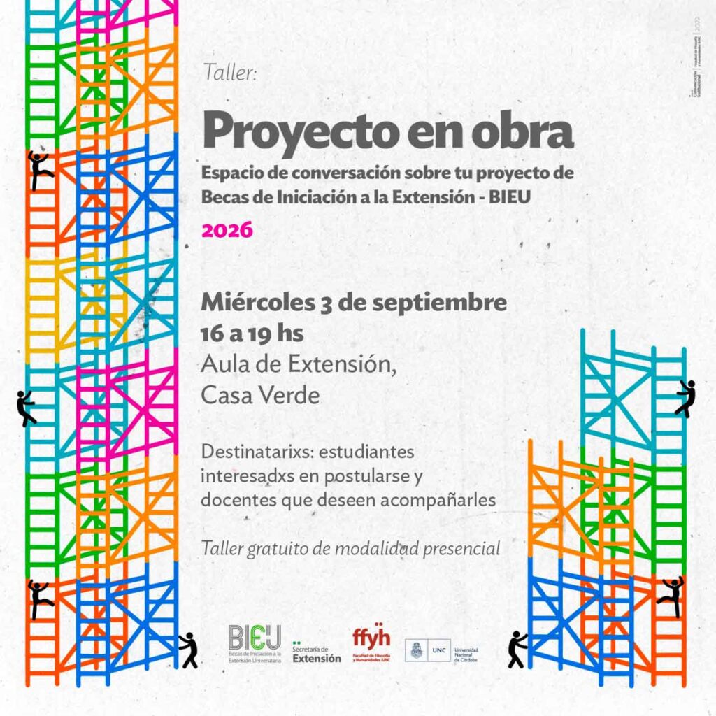 “Proyecto en Obra” son talleres que realiza el equipo técnico de la Secretaría de Extensión destinado a todes les interesades y equipos postulantes para el asesoramiento, acompañamiento y seguimiento en el armado de proyectos, especialmente en la escritura para la presentación a becas BIEU.
