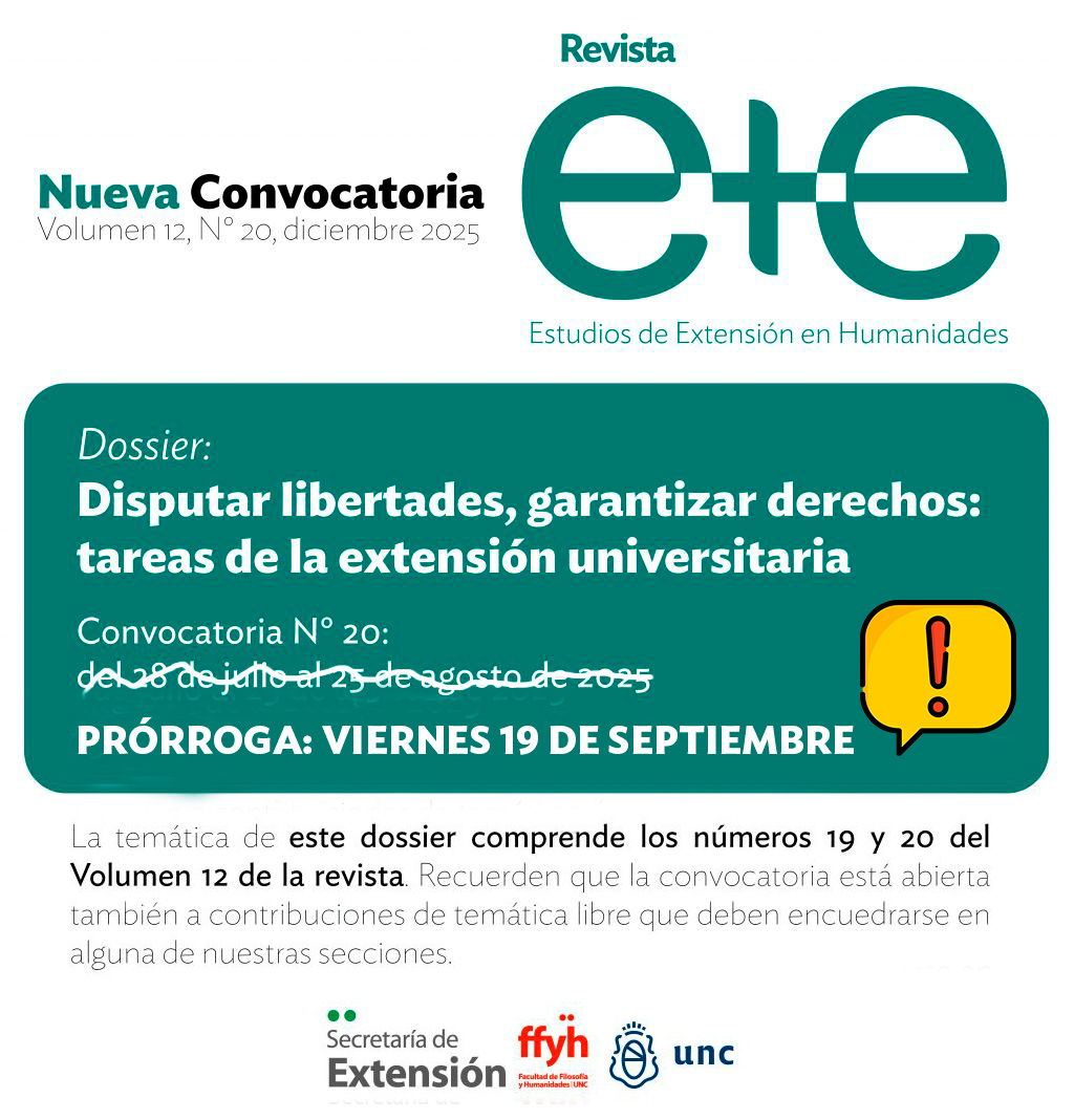 Informamos que se extiende hasta el viernes 19 de septiembre la convocatoria para publicar en el volumen 12, número 20 de la revista E+E: estudios de extensión en humanidades. Este nuevo número se publicará en diciembre de 2025 y llevará por título «Disputar libertades, garantizar derechos: tareas de la extensión universitaria». La temática de este dossier comprende también al N° 19 del Volumen 12 de la revista que se publicó el pasado mes de junio.