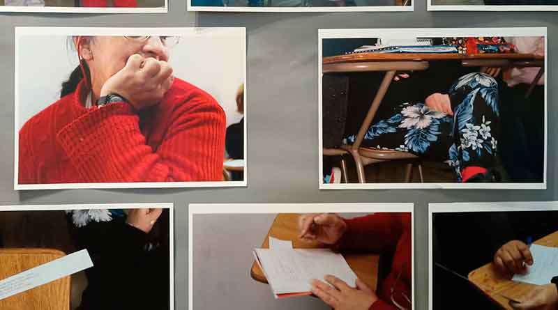 El hall principal del museo aloja algunas fotografías donde vemos en planos detalle a “las del mundo al revés” que están privadas de su libertad. Cada silla de la sala tiene detrás adherido un sobre con fragmentos de cartas y otras están sujetas con broches y cuerdas sobre la pared.