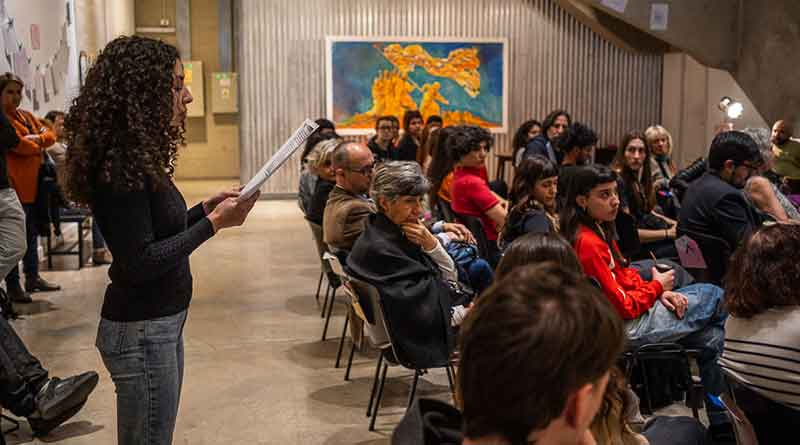 La palabra circula entre las personas encargadas de la presentación. Son mujeres muy distintas una de otra, de diferentes edades, colores y estilos; algunas son profesoras, otras estudiantes, otras no. Lo que las une es que sonríen y se miran buscando complicidad. Cada una -Flavia, Camila, Florencia, Lulú, Carolina- va tocando un tema que se nota han elegido con anterioridad: la relación entre la cárcel y la universidad, las condiciones de los establecimientos penitenciarios, la transformación constante de la propuesta del Taller, la visión del “adentro” y el “afuera”, la desigualdad de género…Mientras tanto Luli va y viene por las escaleras porque está manejando desde el primer piso del Museo el proyector que nos acerca imágenes del libro.