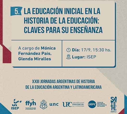 Invitamos a participar del taller «La educación inicial en la historia de la educación: claves para su enseñanza» que se llevará a cabo el miércoles 17 de septiembre a las 15.30 hs. en el ISEP. Esta actividad de extensión estará a cargo de Mónica Fernández Pais y Glenda Miralles y se enmarca en las XXIII Jornadas Argentinas de Historia de la Educación Argentina y Latinoamericana y el IV Encuentro de Investigadorxs en Formación: Volver a contar. Conexiones, rupturas y articulaciones históricas entre educación, cultura y política, que se realizarán del 17 a 20 septiembre de 2025 en la ciudad de Córdoba.