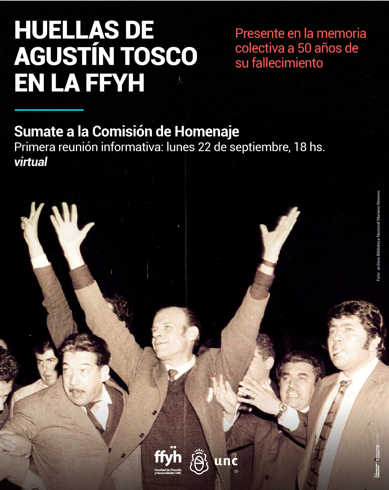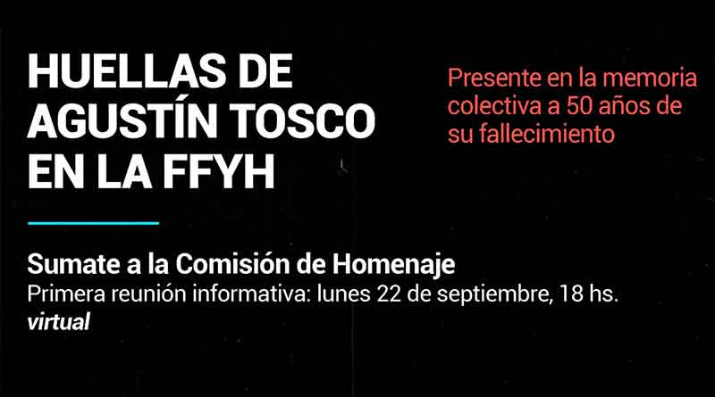 El pasado 8 de septiembre se formó esta comisión en nuestra facultad con el propósito de organizar una serie de actividades para conmemorar a Tosco. La primera reunión informativa será el lunes 22 de septiembre a las 18 hs, de manera virtual. Si te interesa participar de las actividades previstas podés inscribirte desde aquí o enviar un correo a homenajeagustintosco@gmail.com