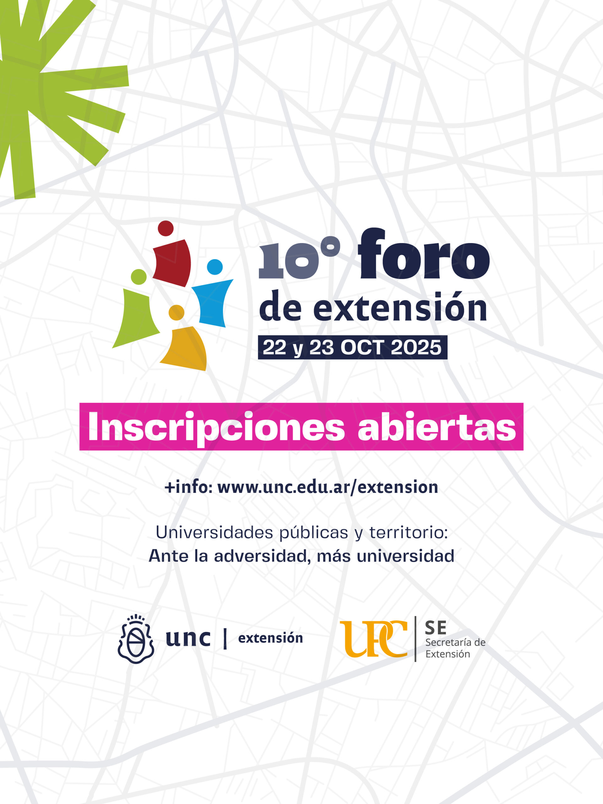El 22 y 23 de octubre de 2025, el 10° Foro de extensión universitaria reunirá más de 200 trabajos aprobados, cerca de 40 experiencias de Becas y Subsidios, 30 videominutos de estudiantes, mapa físico interactivo, diálogo con organizaciones sociales, charlas centrales y mesas de intercambio organizadas en 5 núcleos temáticos. Estos espacios proponen reflexionar sobre el rol transformador de la extensión universitaria y compartir un sin números de trabajos en los más diversos territorios de nuestra provincia. La 10° edición es organizada por las Secretarías de Extensión de la Universidad Nacional de Córdoba y de la Universidad Provincial de Córdoba.