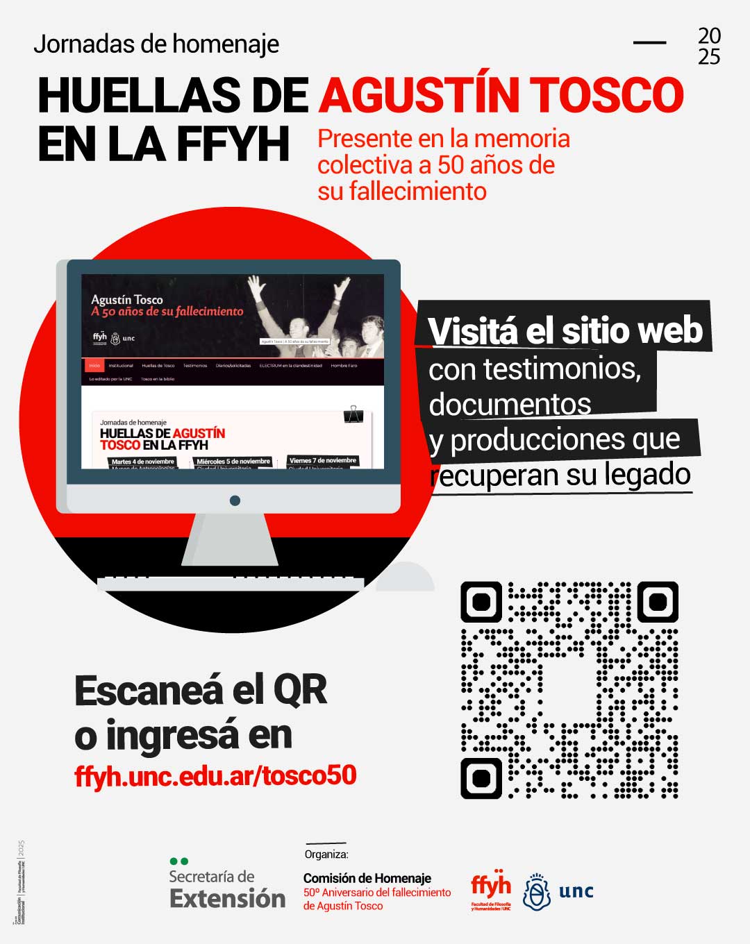 El sitio fue desarrollado por la Secretaría de Extensión en vinculación con la Comisión de Homenaje por el 50º aniversario del fallecimiento de Agustín Tosco y el Área de Prensa de la Facultad de Filosofía y Humanidades y funciona como un repositorio digital que reúne materiales históricos, producciones actuales y archivos vinculados a su figura. Además de registrar las actividades y novedades de las jornadas, la página permite acceder a distintas secciones temáticas que profundizan de diversas maneras su presencia en la memoria colectiva.