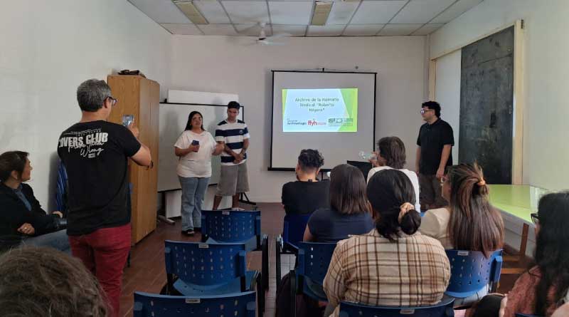 El pasado viernes se realizó la actividad de cierre de estas PSC de las que estuvieron presentes Alejandra Castro, Decana de la FFyH, Liliana Pereyra, Secretaria de Extensión de la FFyH, el Dr. Roberto Nágera, junto al equipo responsable del Archivo y Biblioteca del SUOEM, integrado por Pelu López (de manera virtual), Susana Ledesma y Valentina Bober, además del profesor de la la cátedra de Archivos de Imagen y Sonido responsable institucional de las prácticas, Tito G. Villanueva y la adscripta Lorena Cuéllar.