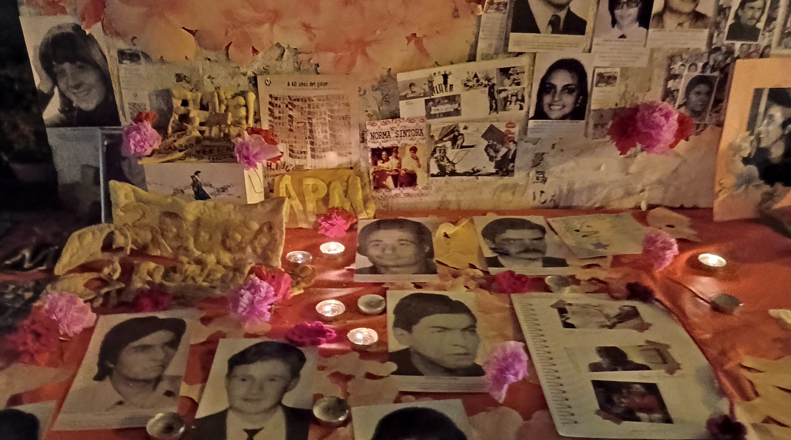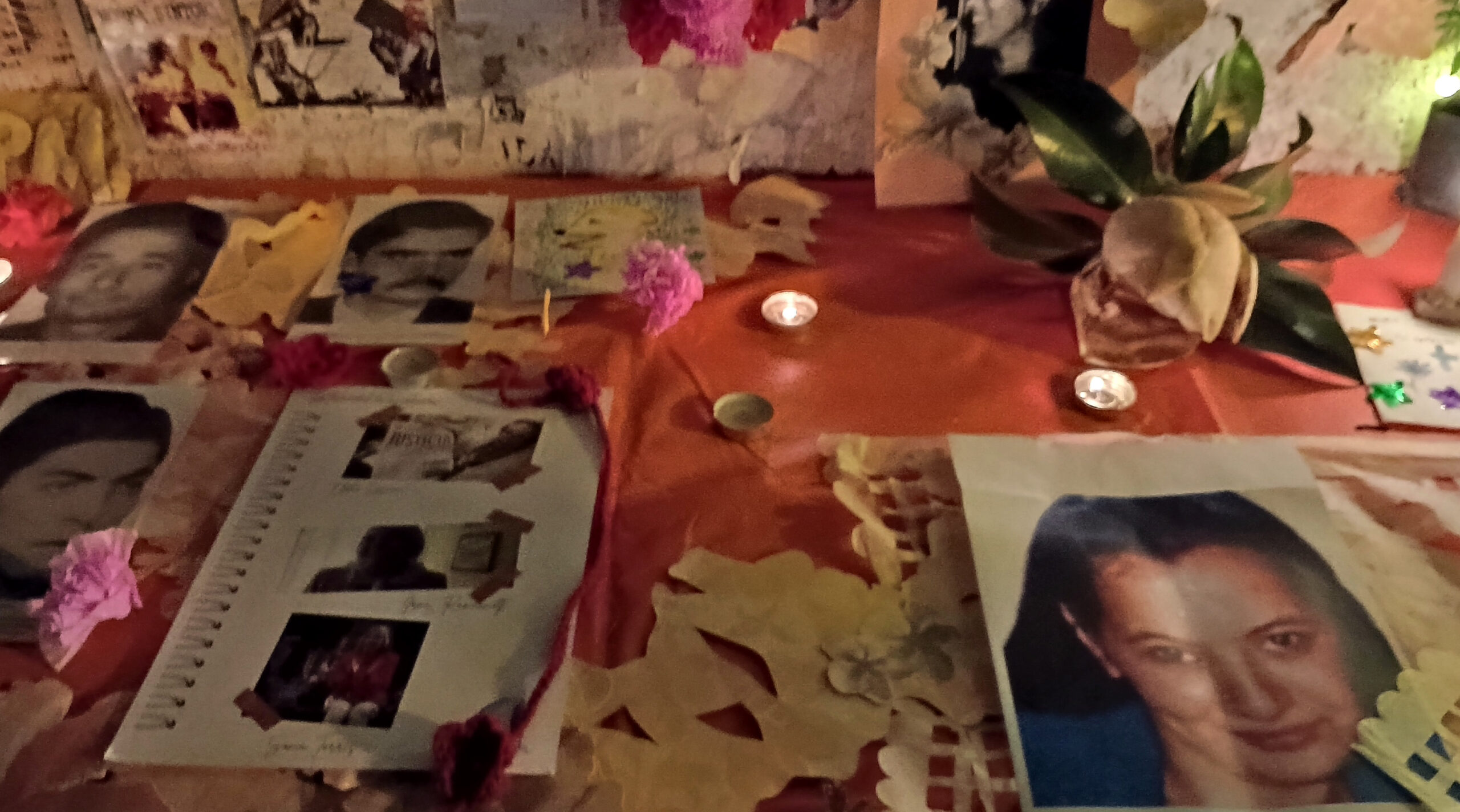 La consigna para ese día era juntarse a la tarde a armar altares con las fotos de la muerta o el muerto cercano, amigo, familiar, vecino, humano y no humano, para poder recordarlos. Pero si una no traía a su propio muertis allí se encontraría con algunx que también le sería familiar, porque estos altares alojaban muertis que hemos sabido llorar y convocar colectivamente como Yamila Cuello, Maite Amaya, Sol Vignolo, Agustín Burgo, Tehuel de la Torre, Mercedes Sosa, el flaco Spinetta o nuestrxs muertis victimas del terrorismo de Estado.