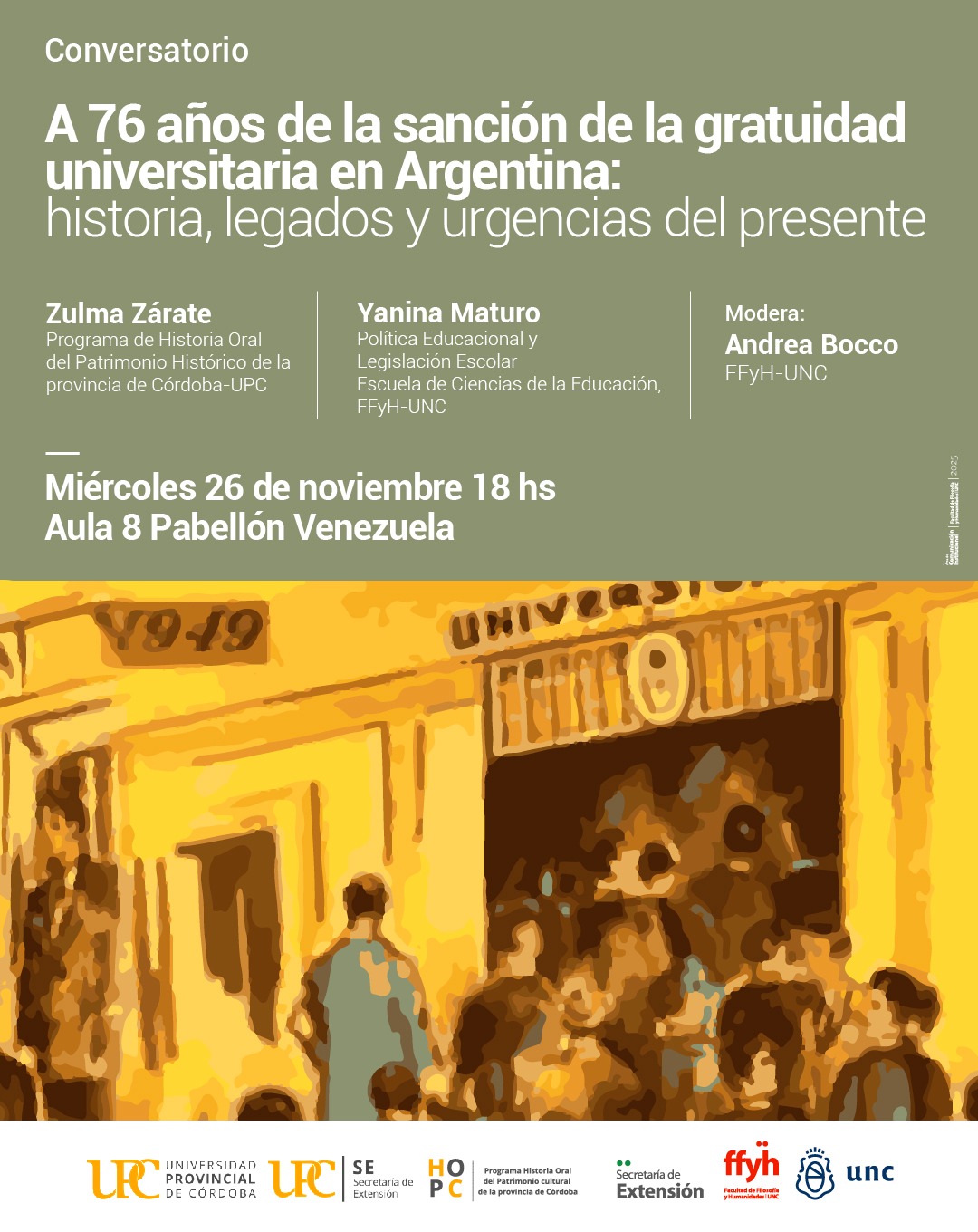 Se llevará a cabo el miércoles 26 de noviembre, a las 18 hs, en el Aula 8 del Pabellón Venezuela (Ciudad Universitaria), a cargo de Zulma Zárate (Programa de Historia Oral del Patrimonio Histórico de la Provincia de Córdoba-UPC) y Yanina Maturo (Política Educacional y Legislación Escolar, Escuela de Ciencias de la Educación, FFyH-UNC). Modera: Andrea Bocco (Vicedecana de la FFyH-UNC).