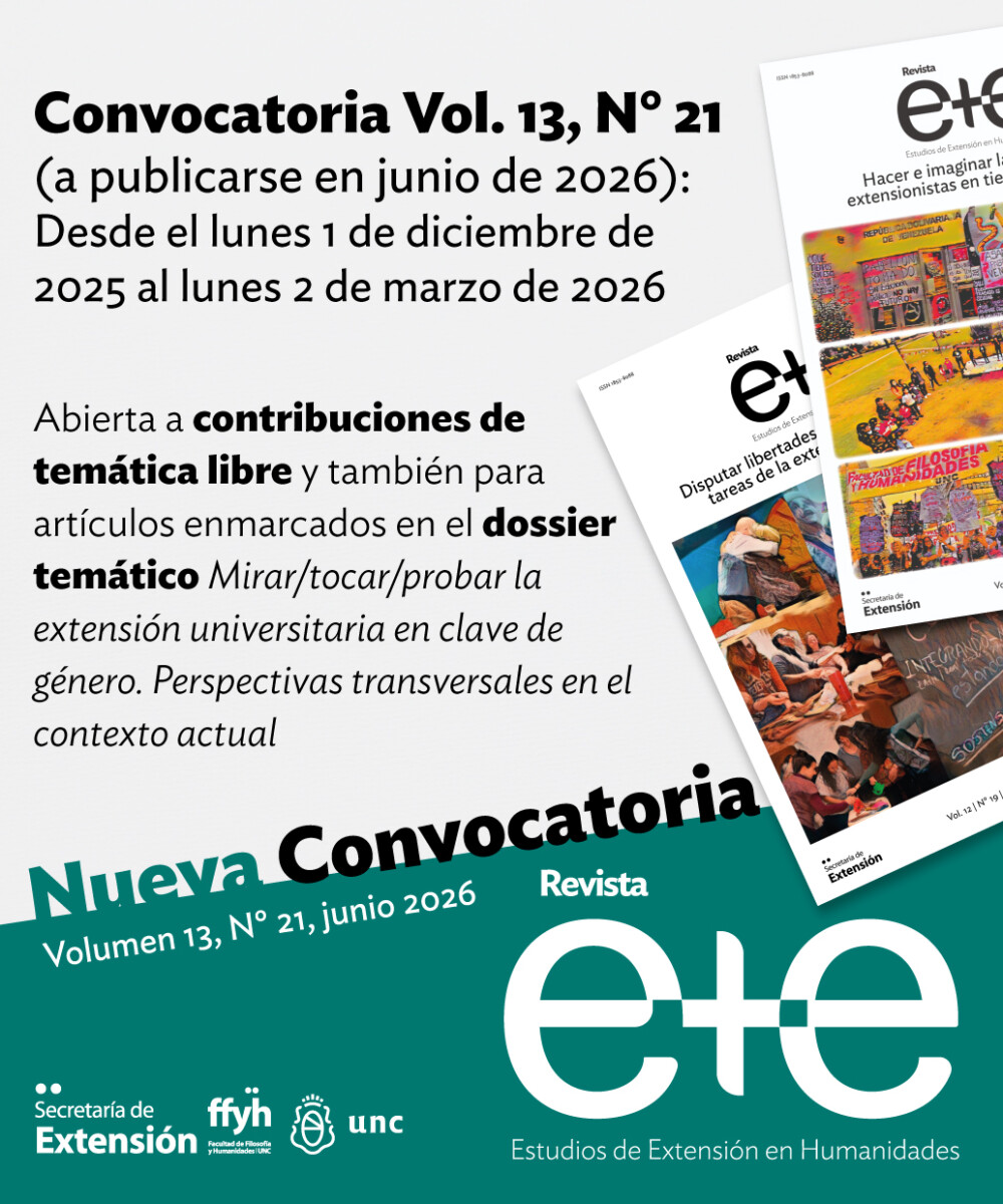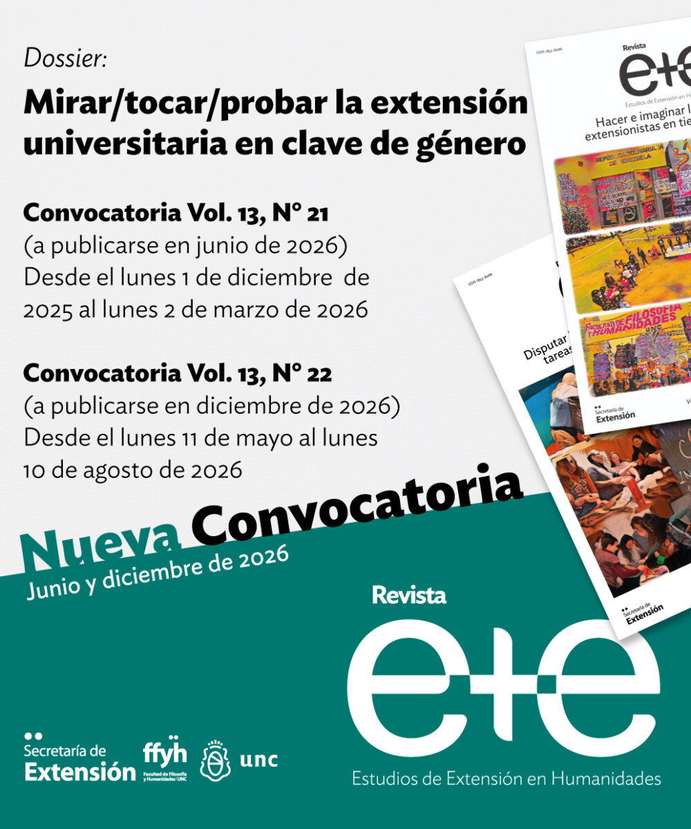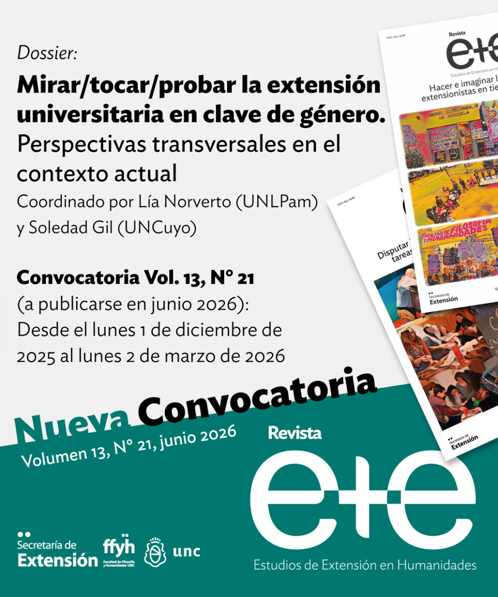 Informamos que desde el 1 de diciembre de 2025 al 2 de marzo de 2026 estará abierta la convocatoria para publicar en el volumen 13, número 21 de la revista «e+e: estudios de extensión en humanidades». Este nuevo número se publicará en junio de 2026 y tendrá un dossier titulado «Mirar/tocar/probar la extensión universitaria en clave de género. Perspectivas transversales en el contexto actual» que será coordinado por Lía Norverto (UNLPam) y Soledad Gil (UNCuyo).