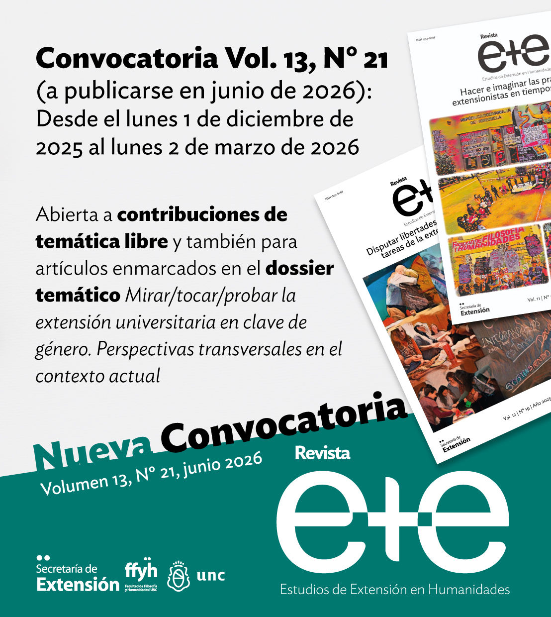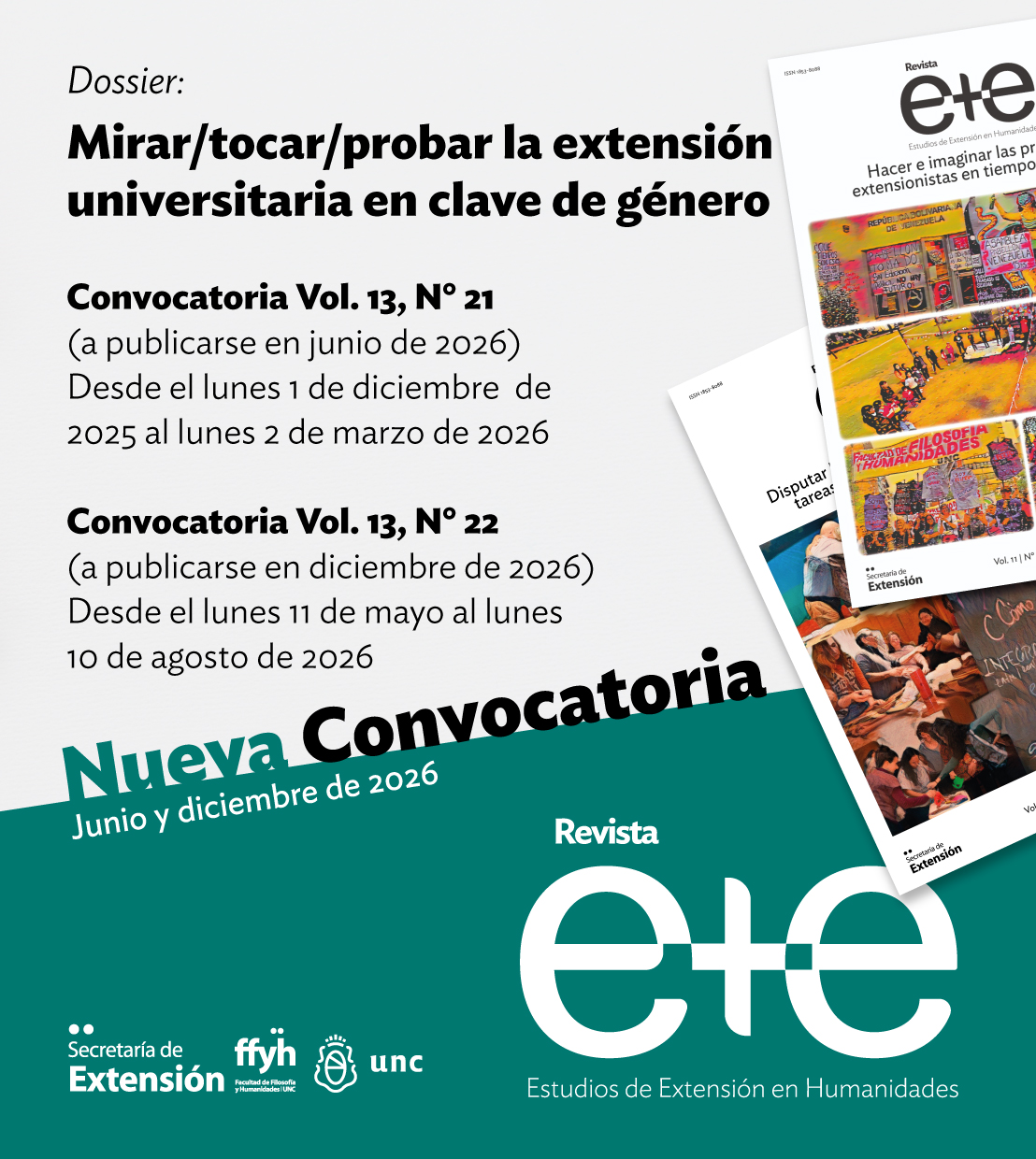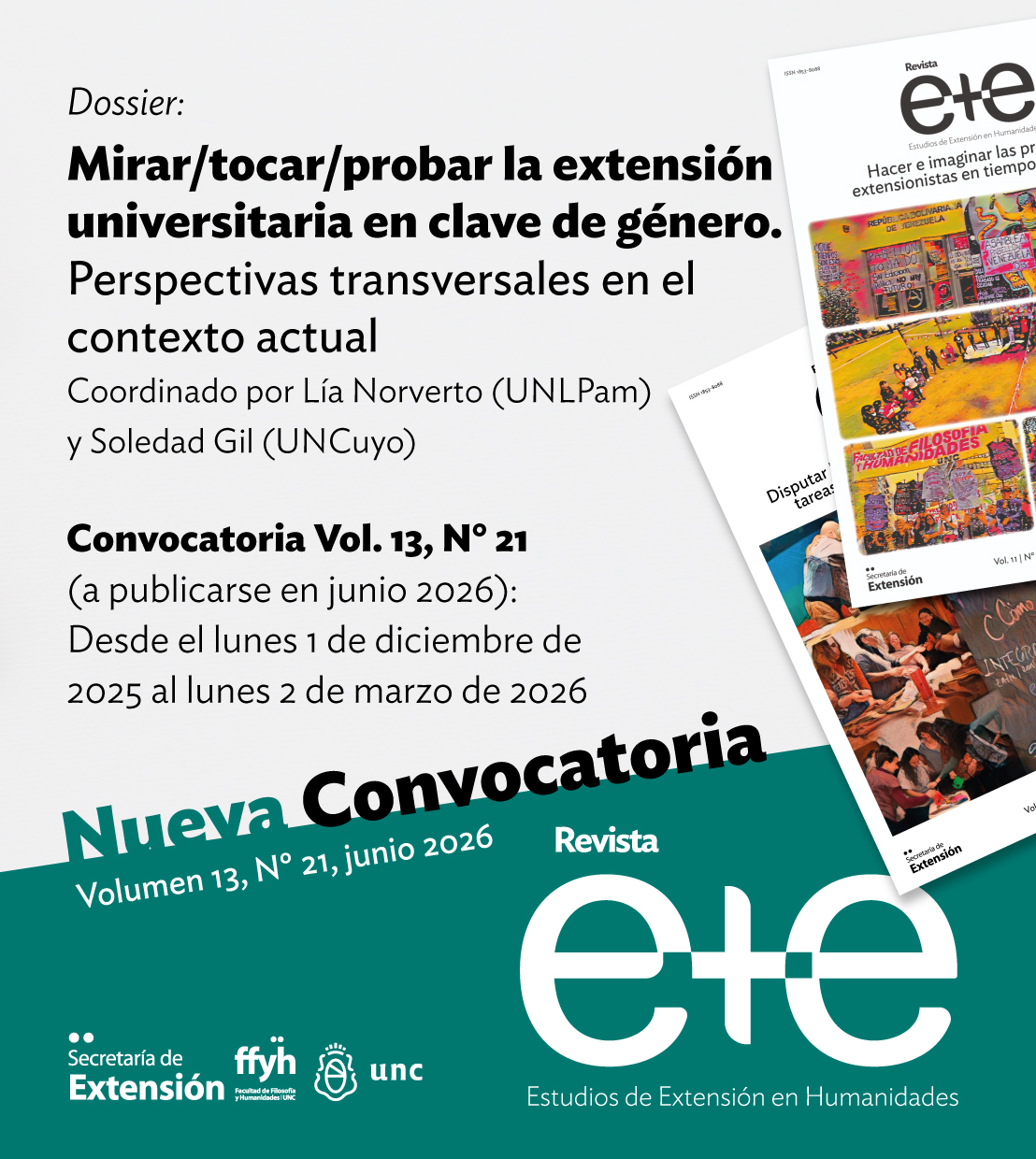 Informamos que desde el 1 de diciembre de 2025 al 2 de marzo de 2026 estará abierta la convocatoria para publicar en el volumen 13, número 21 de la revista «e+e: estudios de extensión en humanidades». Este nuevo número se publicará en junio de 2026 y tendrá un dossier titulado «Mirar/tocar/probar la extensión universitaria en clave de género. Perspectivas transversales en el contexto actual» que será coordinado por Lía Norverto (UNLPam) y Soledad Gil (UNCuyo).