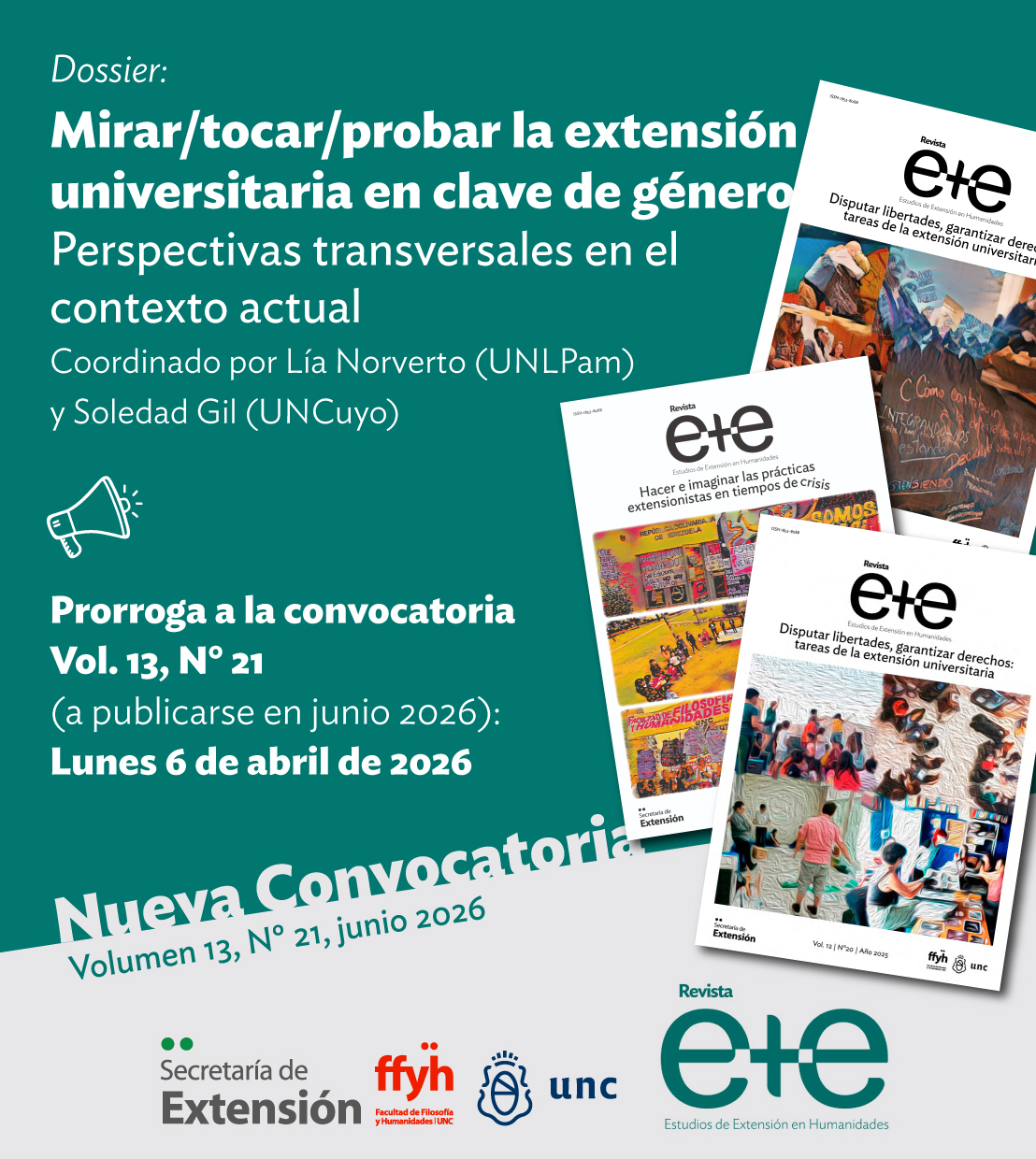 Informamos que se extiende hasta el 6 de abril de 2026 la convocatoria para publicar en el volumen 13, número 21 de la revista «e+e: estudios de extensión en humanidades». Este nuevo número se publicará en junio de 2026 y tendrá un dossier titulado «Mirar/tocar/probar la extensión universitaria en clave de género. Perspectivas transversales en el contexto actual» que será coordinado por Lía Norverto (UNLPam) y Soledad Gil (UNCuyo).