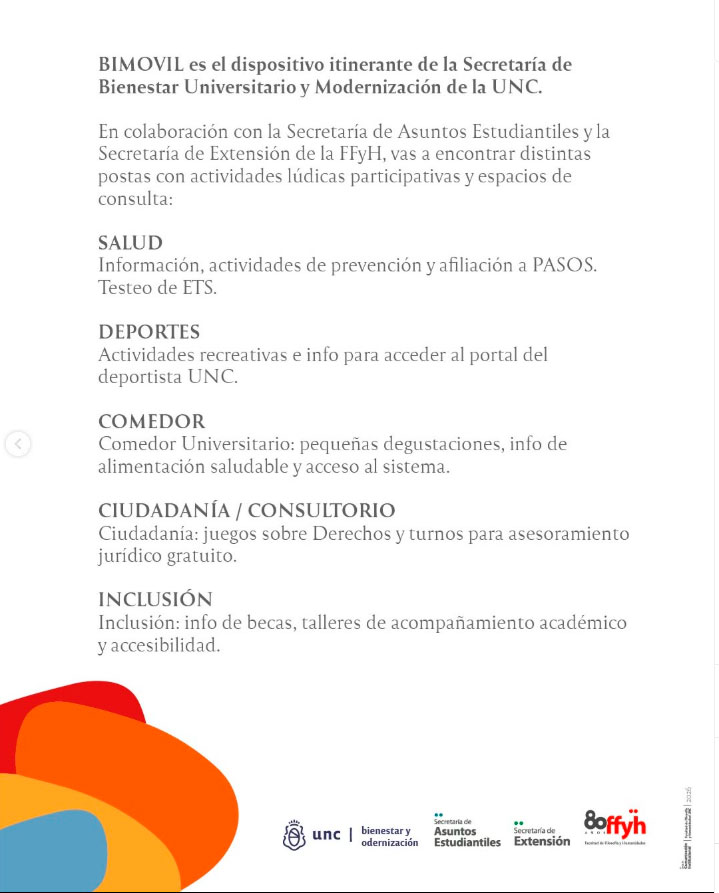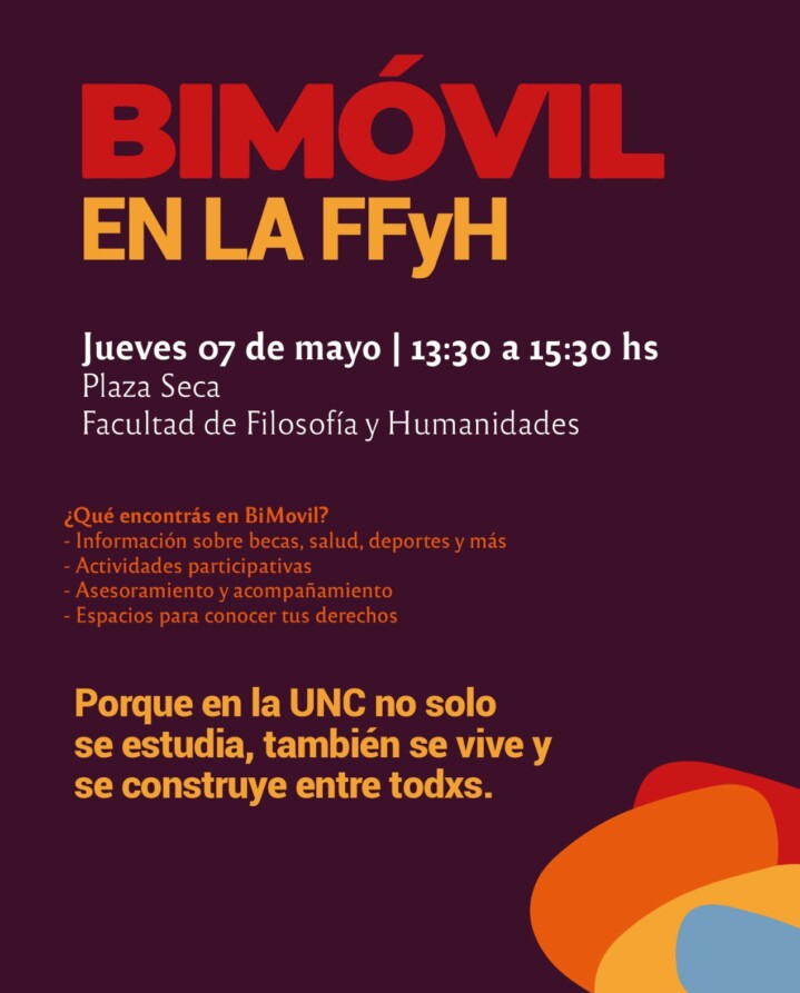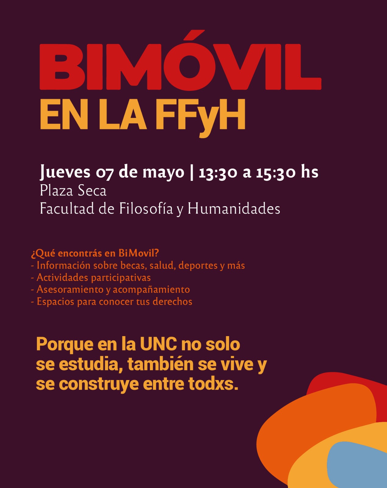 El dispositivo itinerante BIMÓVIL, impulsado por la Secretaría de Bienestar Universitario y Modernización de la UNC, estará presente el jueves 7 de mayo, de 13:30 a 15:30 hs, en la Plaza Seca de la Facultad de Filosofía y Humanidades. Se trata de una propuesta que acerca a la comunidad universitaria información, servicios y actividades en torno al bienestar estudiantil, en un formato accesible y participativo.