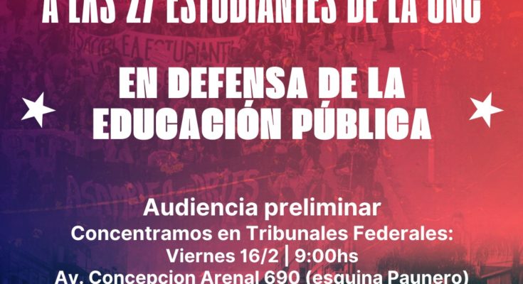 Invitamos a acompañar la concentración que se llevará a cabo el día viernes 16 de febrero, a las 9 hs, en la puerta de Tribunales Federales, a instancias de la audiencia preliminar reparatoria, en el marco del inicio del juicio de la causa en la que se procesó por el delito de usurpación por despojo a 27 estudiantes de la UNC que participaron del masivo conflicto educativo nacional de 2018.