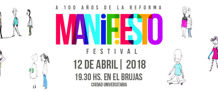 El jueves 12 de abril, desde las 19:30 hs, en el Pabellón Brujas (Ciudad Universitaria) se realizará el Festival Manifiesto, con motivo de festejar los 100 años de la Reforma Universitaria y dar la bienvenida a los estudiantes de la Facultad de Filosofía y Humanidades.
