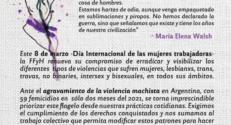 Este 8 de marzo -Día Internacional de las mujeres trabajadoras- la FFyH renueva su compromiso de erradicar y visibilizar los diferentes tipos de violencias que sufren mujeres, lesbianxs, trans, travas, no binaries, intersex y bisexuales, en todos sus ámbitos.