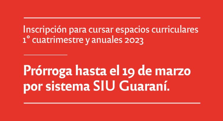 La Secretaría Académica de la Facultad de Filosofía y Humanidades de la UNC informa que la fecha de inscripción a cursar los espacios curriculares del 1° cuatrimestre y anuales 2023 (de 1° a 5° años de todas las carreras de la Facultad), pautada originalmente hasta el día 13 de marzo de 2023 según Calendario Académico, ha sido extendida hasta el día 19 de marzo por sistema SIU Guaraní.