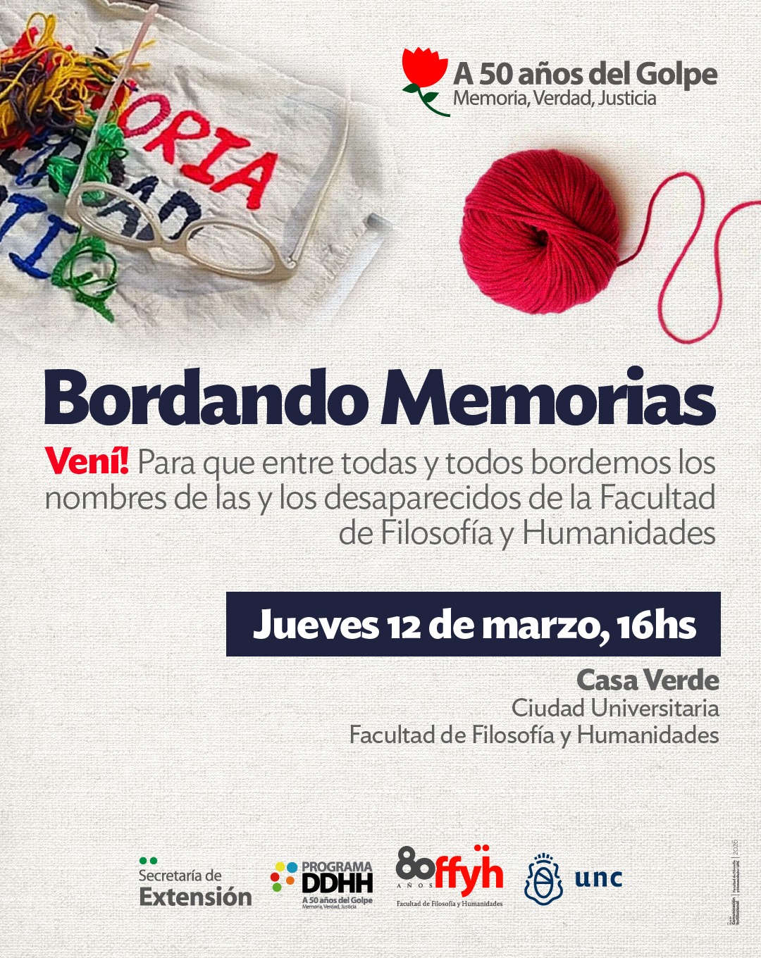 “La propuesta es sencilla y profunda: entre todos y todas bordaremos los nombres de las y los desaparecidos de la FFyH, para construir juntos una estela de nombres que llevaremos a la Marcha del próximo 24 de marzo”, dicen desde la Secretaría de Extensión y el Programa de Derechos Humanos de la Facultad, impulsoras de una convocatoria destinada a estudiantes, egresados, docentes y nodocentes, pero abierta también a la comunidad en general.