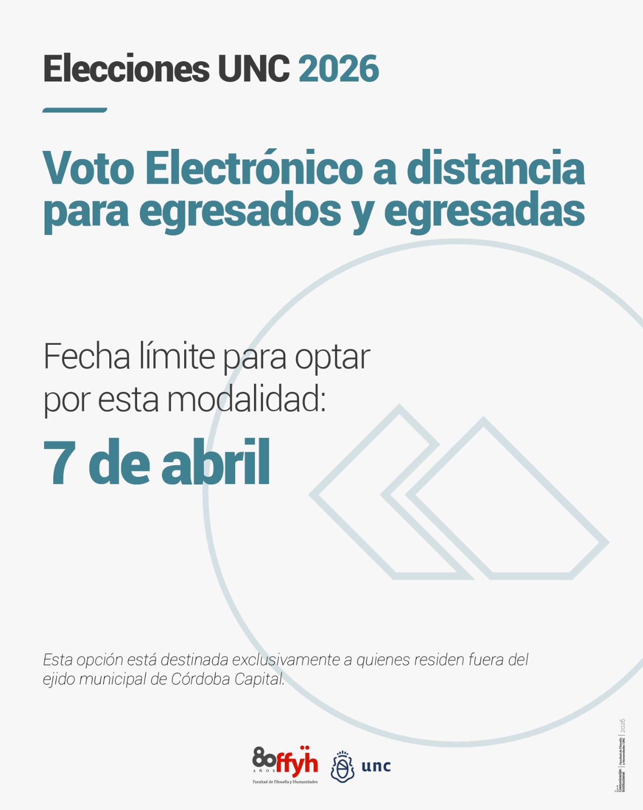 La Facultad de Filosofía y Humanidades recuerda a toda la comunidad de egresados y egresadas que el próximo 7 de abril es la fecha límite para optar por la modalidad de Voto Electrónico a Distancia. Esta opción está destinada exclusivamente a quienes residen fuera del ejido municipal de Córdoba Capital.