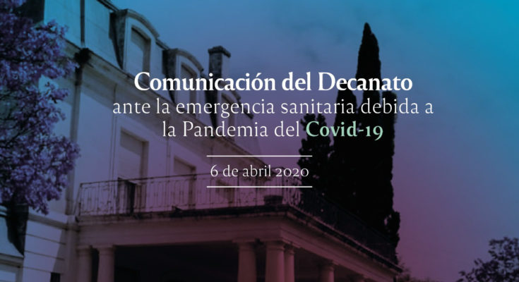 Nuestra Facultad asumió las disposiciones nacionales y rectorales en lo que concierne a la suspensión del comienzo de las clases de grado, que en primera instancia fue hasta el 25 de marzo, y luego hasta el 31 de marzo. El inicio de clases bajo la modalidad virtual se pautó para el 1 de abril, en el marco del aislamiento social preventivo por la actual emergencia sanitaria debida a la pandemia del Covid-19, que hasta el momento se ha extendido hasta el 12 de abril.