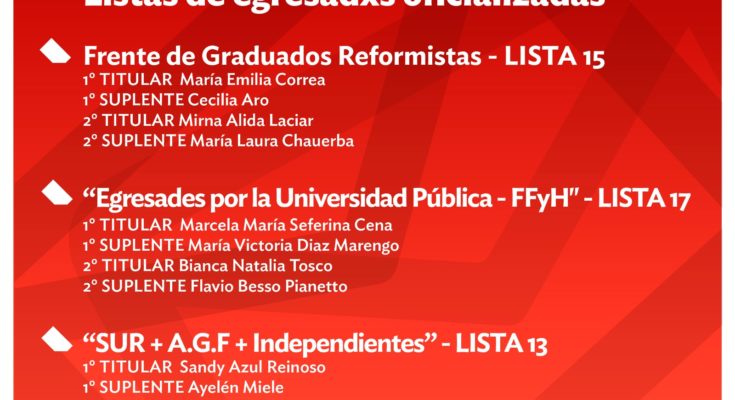 La Junta Electoral de la FFyH pone a disposición de la comunidad el acta de oficialización de las listas de candidatxs del claustro de graduadxs para el Consejo Directivo, que participarán en la elección convocada para los días 15 y 16 de mayo de 2024.