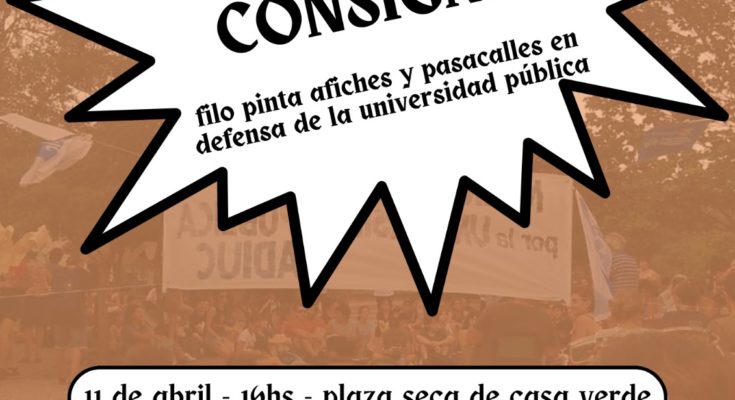 Por ello, el Foro Interclaustro por la Universidad Pública, la Ciencia y la Democracia organiza Pintá tu consigna para el jueves 11 de abril, a las 16 hs, en Plaza Seca (Casa Verde), una actividad en la que toda la comunidad de la Facultad de Filosofía y Humanidades está invitada a fabricar pasacalles y afiches con consignas en defensa de la Universidad que luego serán dispuestos en diversos espacios físicos de la FFyH.