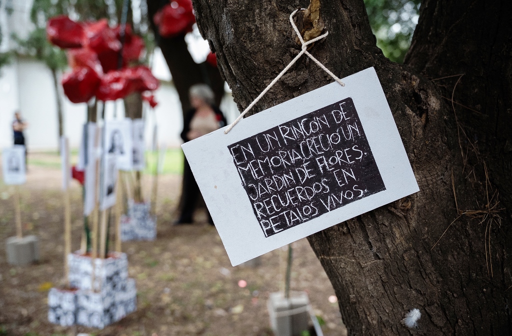 Desde los diferentes pabellones, la gente caminó hasta el Venezuela, donde la intervención artística «El jardín de la memoria» recibía al público que colmó las instalaciones, para ser testigo y protagonista de un ritual con imágenes de los estudiantes y egresadxs, y el descubrimiento de un Memorial en una de las paredes de ingreso al Auditorio Hugo Chávez. En ese espacio, el acto arrancó con personas siguiendo la transmisión que el escenario central emitía en dos aulas del Pabellón Venezuela, también ocupadas al máximo.