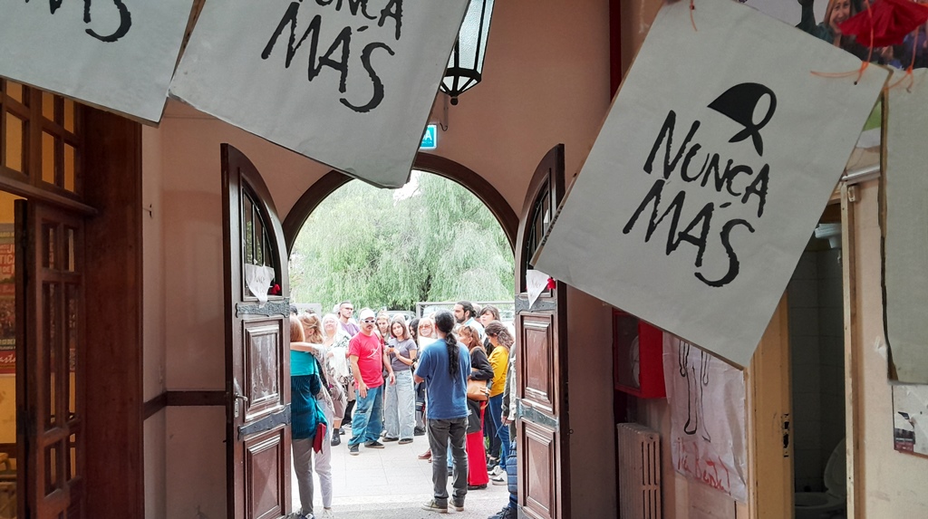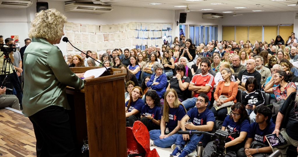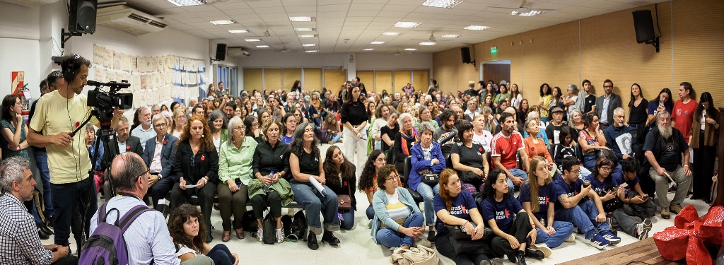 La otra pregunta que socializó ante un auditorio muy conmovido por todo lo que se venía experimentando y viviendo, giró en torno a ¿cómo hacer la transmisión intergeneracional de toda esta historia? ¿Cómo transmitimos esto a las nuevas generaciones? “Pienso en la universidad por donde pasan tantos/as jóvenes. Es una pregunta que nos interpela y cuya respuesta no es sencilla ni univoca. La transmisión es un proceso social, cultural, político, vinculado a los procesos que nos constituyen como comunidad. Las instituciones educativas tenemos un rol en esa transmisión, en transmitir un legado entre generaciones. Esta transmisión no es lineal, ni transparente, ni exenta de tensiones. Pero si debiera ser generosa, tenemos que estar dispuestos a que quienes reciban ese legado, lo tomen y lo transformen, que hagan algo diferente, algo nuevo con eso que reciben”.
