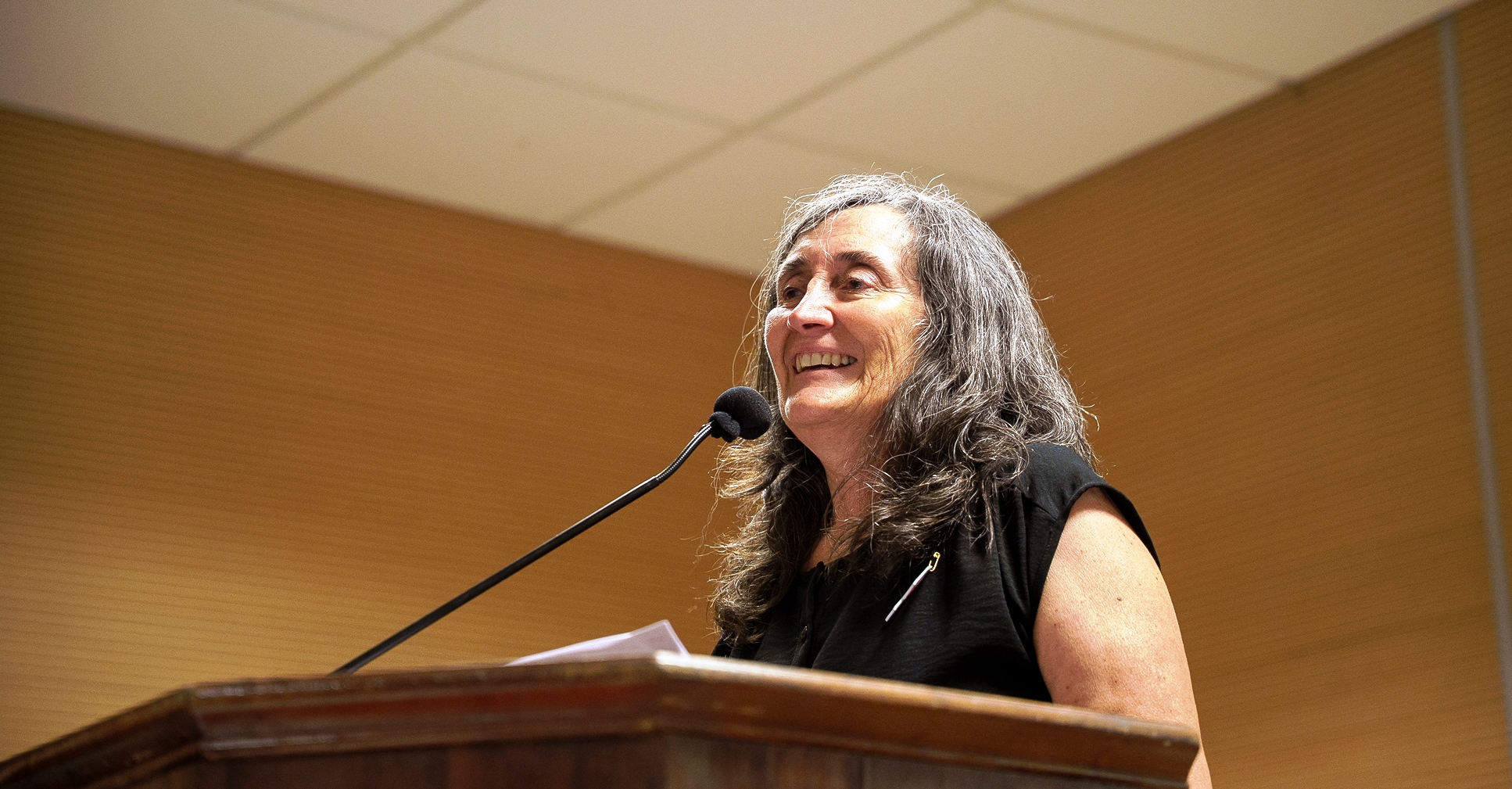 La apasionada voz de Silvia Lonatti, trabajadora nodocente e histórica conductora de actos y colaciones de la FFyH, abrió paso a los discursos de las autoridades que representaban a las instituciones comprometidas en el acto de reparación. La primera en tomar la palabra fue la anfitriona, Alejandra Castro, quien destacó y nombró el trabajo colectivo de toda la comunidad universitaria -docentes, estudiantes, egresados y no docentes-, como así también a las instituciones y personas que hicieron posible esta reparación mediante investigaciones, reconstrucción de historias y acciones simbólicas: “Esto no es solo un trámite administrativo, es un acto político, simbólico y afectivo que busca reivindicar la dignidad de las víctimas. Un hecho de memoria colectiva y de comunidad que busca reconstruir la memoria institucional. Ahora, ¿Qué sentido/s que tienen la reparación de los legajos?, ¿Cómo hacer la transmisión entre generaciones, entre contemporáneos de esta historia, de este legado? ¿Por qué reparar? En primer lugar, cualquier reparación implica reconocer que se ha infligido un daño, un quiebre, sobre un objeto, animado o inanimado, que interrumpe la tarea o relación que éste cumplía. Cuando decidimos reparar es porque queremos nuevamente traerlos a la vida, a la función para la que habían sido concebidos, ponerlos/as a nuestro lado para que sigan estando”.