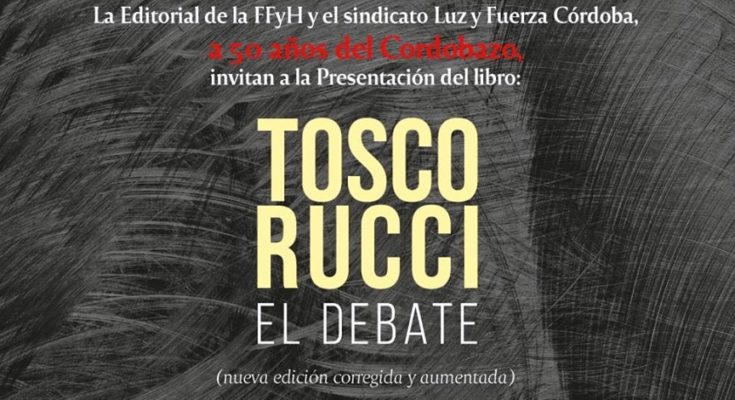 A 50 años del Cordobazo, el martes 28 de mayo, a las 20 horas, en el Salón Agustín Tosco del Sindicato de Luz y Fuerza de Córdoba (Deán Funes 672), se presentará el libro “Tosco-Rucci. El debate”, con la participación de Leandro Inchauspe, Virginia Carranza, Héctor Tosco y Gabriel Suárez. Se trata de una nueva edición corregida y aumentada, que fue publicada entre la Editorial de la Facultad de Filosofía y Humanidades de la UNC y el Sindicato Luz y Fuerza Córdoba.