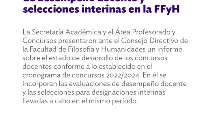 La Secretaría Académica y el Área Profesorado y Concursos presentaron ante el Consejo Directivo de la Facultad de Filosofía y Humanidades un informe sobre el estado de desarrollo de los concursos docentes conforme a lo establecido en el cronograma de concursos 2022/2024. En él se incorporan las evaluaciones de desempeño docente y las selecciones para designaciones interinas llevadas a cabo en el mismo período.
