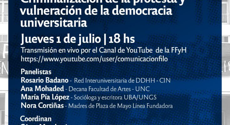 En el marco del ciclo de conversatorios contra la judicialización de la protesta estudiantil, el jueves 1º de julio, a las 18 hs, en vivo por el canal de YouTube de la FFyH: https://www.youtube.com/comunicacionfilo se realizará el segundo encuentro, titulado: “Criminalización de la protesta y vulneración de la democracia universitaria”. En el panel participarán Rosario Badano (Red Interuniversitaria de Derechos Humanos – CIN), María Pía López (socióloga y escritora UBA/UNGS), Nora Cortiñas (Madres de Plaza de Mayo Línea Fundadora) y Ana Mohaded (Decana de la Facultad de Artes – UNC). Estará coordinado por César Marchesino (Programa de Derechos Humanos – FFyH) y María Martinez (SAE-FFyH).