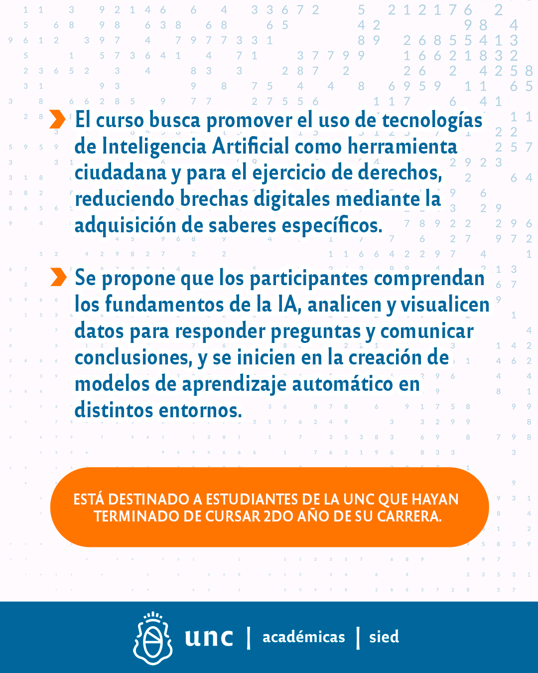 La Secretaría de Asuntos Académicos de la UNC lanza este curso destinado a estudiantes de todas las Facultades. Tiene como objetivo comprender los fundamentos de la IA, analizar y visualizar datos, e iniciarse en la creación de modelos de aprendizaje automático.