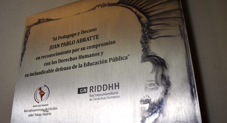 Agradecemos especialmente a la Red Latinoamericana de Estudios sobre Trabajo Docente (ESTRADO) y a la Red Interuniversitaria de Derechos Humanos (RIDDHH) del Consejo Interuniversitario Nacional (CIN) por el sentido homenaje realizado a Juan Pablo a través de la placa colocada recientemente en el hall central de Pabellón Residencial con motivo del día de lxs maestrxs y que nos permite recordarlo con las palabras allí inscriptas: “Al Pedagogo y Decano JUAN PABLO ABRATTE en reconocimiento por su compromiso con los Derechos Humanos y su inclaudicable defensa de la Educación Pública”.