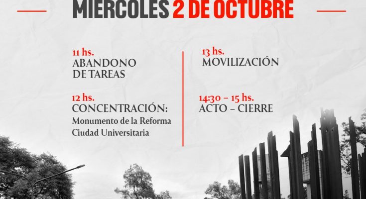 En la reunión realizada entre autoridades rectorales y decanales de la UNC, representantes de los gremios docente y nodocente y la FUC, se definió convocar a la MARCHA FEDERAL UNIVERSITARIA, el miércoles 2 de octubre, a las 13 hs, desde el Monumento de la Reforma en Ciudad Universitaria.