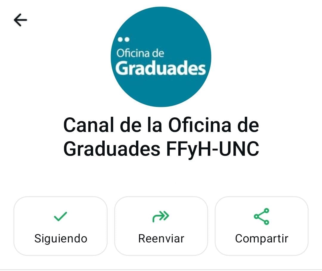 La Oficina de Graduades tiene un nuevo canal de contacto directo. Además de los medios institucionales, como el correo electrónico: graduados@ffyh.unc.edu.ar y la cuenta oficial de Instagram: https://www.instagram.com/graduados.ffyh , ahora se incorporó un canal de WhatsApp al que podés acceder fácilmente a través de este enlace: https://whatsapp.com/channel/0029VbCCyi660eBp0myAzM47