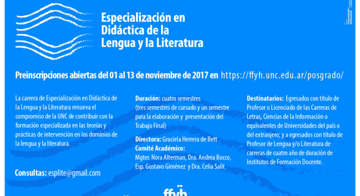 La carrera de Especialización en Didáctica de la Lengua y la Literatura reconoce como antecedente la Especialización en la Enseñanza de la Lengua y la Literatura, que se empezara a dictar en 1998 y renueva el compromiso de la UNC de contribuir con la formación especializada en las teorías y prácticas de intervención en los dominios de la lengua y la literatura. En esta dirección, se hace eco de una demanda social por la democratización de los saberes desde uno de los contextos de producción y distribución más calificados: la educación superior.