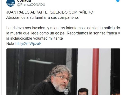 El desconcierto y la tristeza nos invaden, mientras intentamos asimilar la noticia de la muerte que llega como un golpe, y no dejamos de recordar la sonrisa franca y la inclaudicable voluntad militante de nuestro querido compañero Juan Pablo Abratte. https://t.co/eWXe9K7I87 pic.twitter.com/oXSkpAPzCR