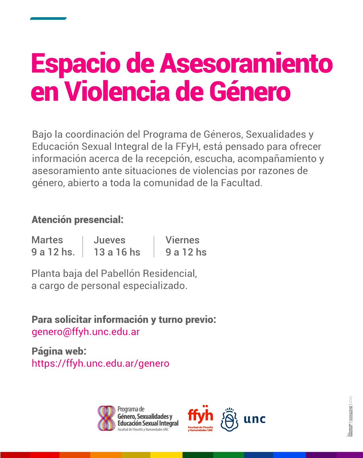 Más información: https://ffyh.unc.edu.ar/genero/espacio-de-asesoramiento-en-violencia-de-genero/