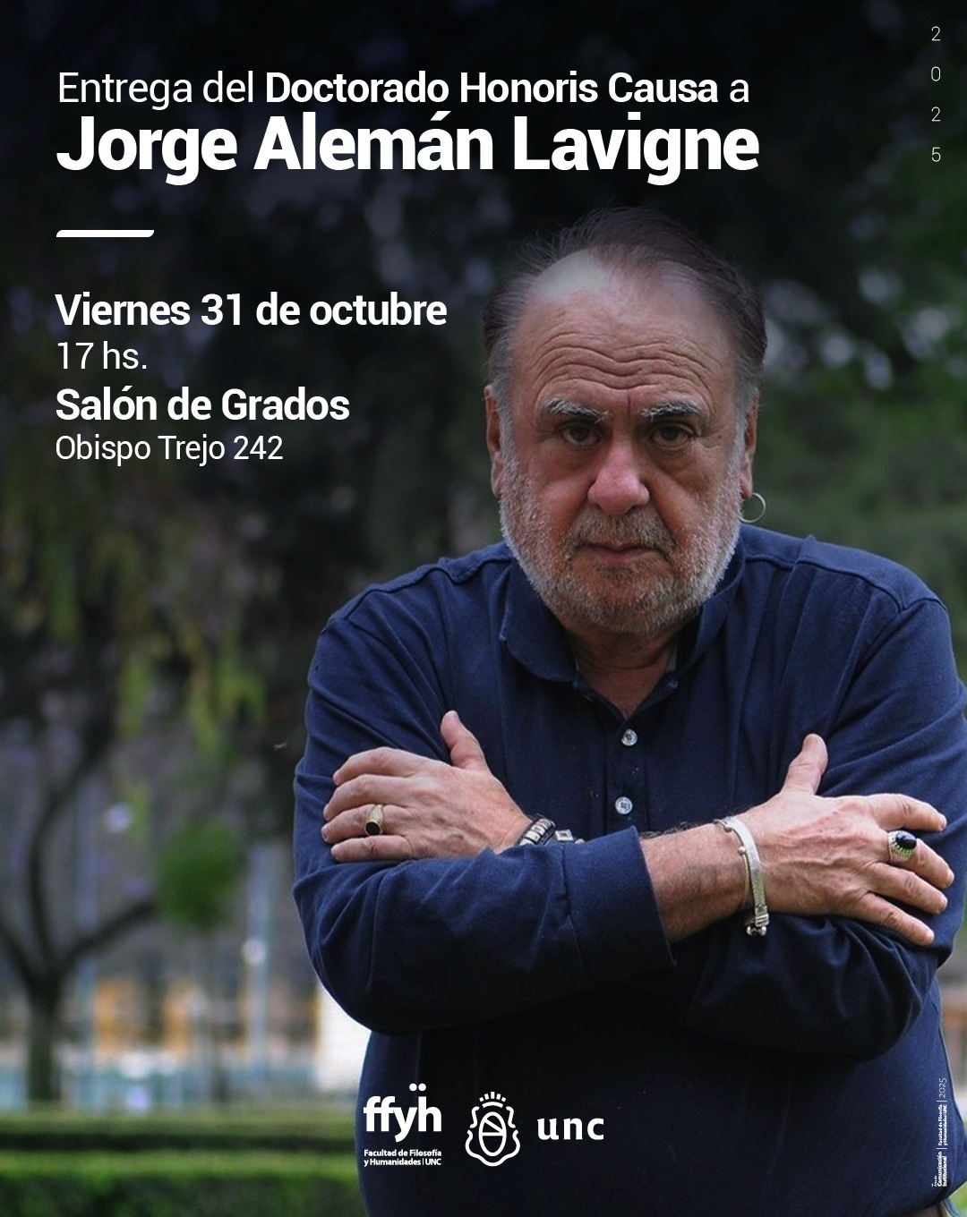 La ceremonia de la entrega del Doctorado Honoris Causa  será el viernes 31 de octubre, a las 17 hs, en el Salón de Grados del Antiguo Rectorado (Obispo Trejo 242). La distinción fue solicitada por el Consejo Directivo de la FFyH y aprobada por el Consejo Superior de la UNC. Por otro lado, el sábado 1º de noviembre a las 11 hs, en la sede de ADIUC se realizará con conversatorio con Jorge Alemán.