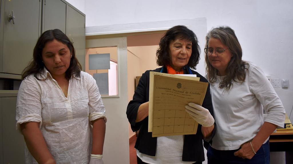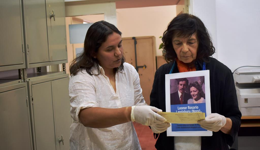 Como parte del trabajo de reparación histórica que la Facultad viene haciendo con sus  estudiantes desaparecidxs, el 8 de octubre, en el Archivo Central de esta unidad académica, la Decana, Alejandra Castro, la Coordinadora del Programa de Derechos Humanos, Ludmila Da Silva Catela, y la Vicedirectora de la Escuela de Ciencias de la Educación, Edurne Esteves, junto con  Analía Santillán y Tito Villanueva, trabajadorxs del Archivo de la FFyH, entregaron una copia de los legajos de Leonor y Juan Carlos a María Ester, que viajó desde Buenos Aires, donde reside, para seguir atesorando el material que le permita continuar reconstruyendo el archivo biográfico de su hermana, su esposo y su sobrino o sobrina, a quien María sigue buscando como integrante de Abuelas de Plaza de Mayo, organismo que ya recuperó y devolvió la identidad a 140 nietxs apropiadxs por represores, aunque aún se calcula que faltan más de 300.