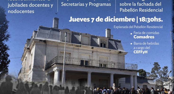 A las 19:15 será el acto de cierre del ciclo lectivo 2023 y se hará la entrega de reconocimientos a docentes y nodocentes que se jubilaron este año. Finalmente, a las 20:30, comenzará la intervención PALIMPSESTO sobre la fachada del Pabellón Residencial, a cargo de Gabriel Orge y se hará una mención especial a las autoridades decanales elegidas democráticamente desde los años 80.
