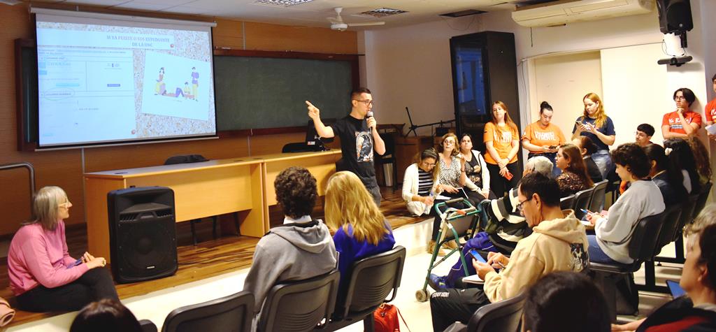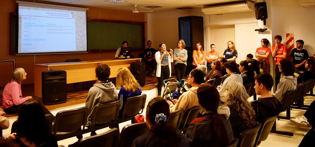 A las 11 de la mañana, el Secretario de Asuntos Estudiantiles, Ezequiel Rogna, y la Vicedecana de la FFyH, Andrea Bocco, les dieron la bienvenida a quienes asistieron a las Jornadas de Puertas Abiertas. Luego, personal nodocente del Despacho de Alumnxs explicó cómo realizar la inscripción mediante el Sistema Guaraní, y después integrantes de las organizaciones estudiantiles que conforman el Centro de Estudiantes dirigieron unas palabras a lxs aspirantes al Ingreso 2026, actividades que se repitieron en el turno tarde.