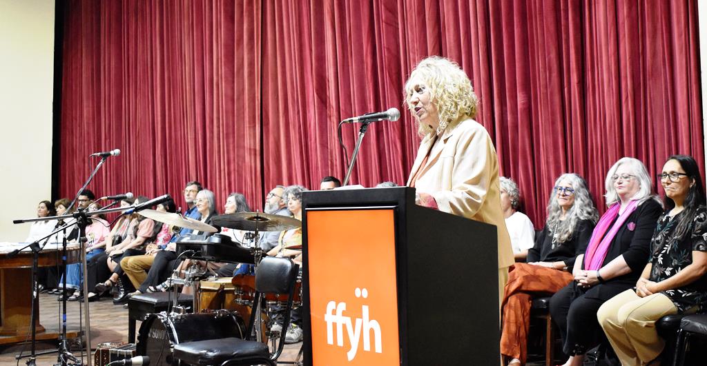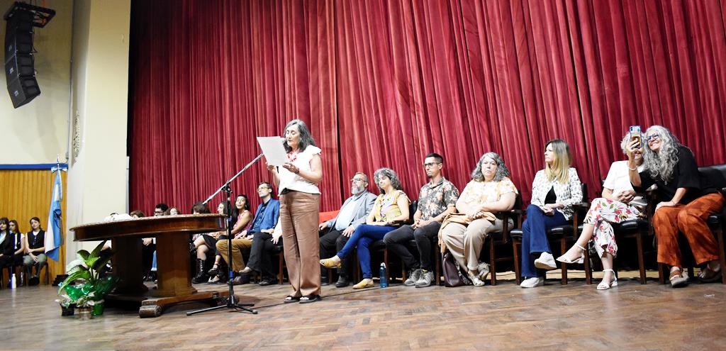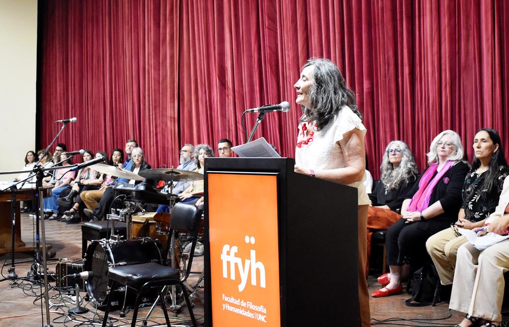 “Esperamos haber contribuido a la edificación de diferentes perspectivas para leer, estudiar, investigar e intervenir en el mundo, lo que implica reconocer diversos modos de construcción de conocimientos y saberes, y también la capacidad para adoptar y revisar posiciones éticas y políticas”, señaló la Decana de la FFyH en el segundo punto de un discurso que buscó poner en valor el inmenso logro que se estaba celebrando, situado en un contexto político y económico muy desfavorable para la educación superior.