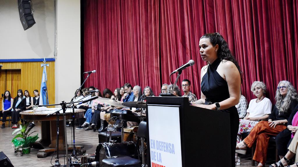 El tercer punto de Castro hizo foco en la actual coyuntura que atraviesa el sistema universitario público de educación, “en riesgo tal como lo conocemos” por los recortes presupuestarios del gobierno de Milei. “Se trata de un sistema que costó mucho esfuerzo reconstruir durante los últimos 50 años, después del brutal desmantelamiento que sufrió durante la dictadura militar. Las movilizaciones sociales y el acompañamiento de gran parte de la sociedad en la defensa de la universidad pública han sido contundentes y alientan nuestra lucha, pero también hoy nos enfrentamos a la necesidad de exigir la implementación de la Ley de financiamiento del sistema universitario sancionada recientemente”.