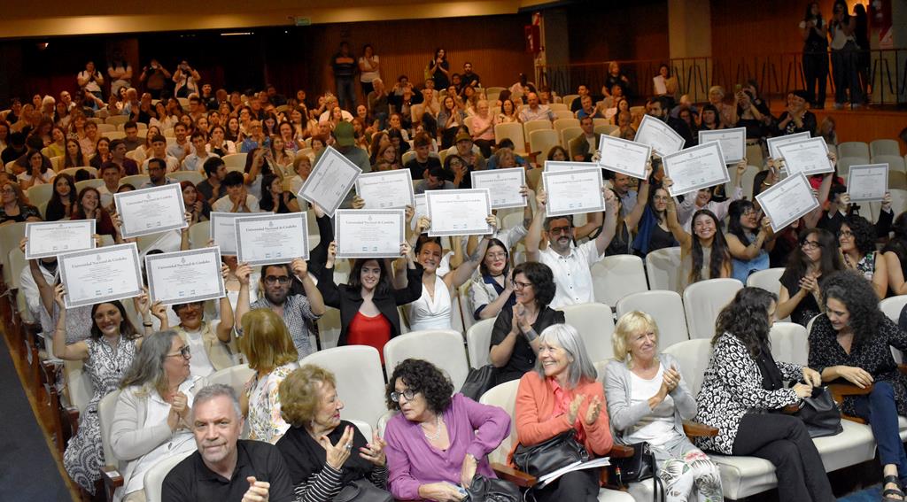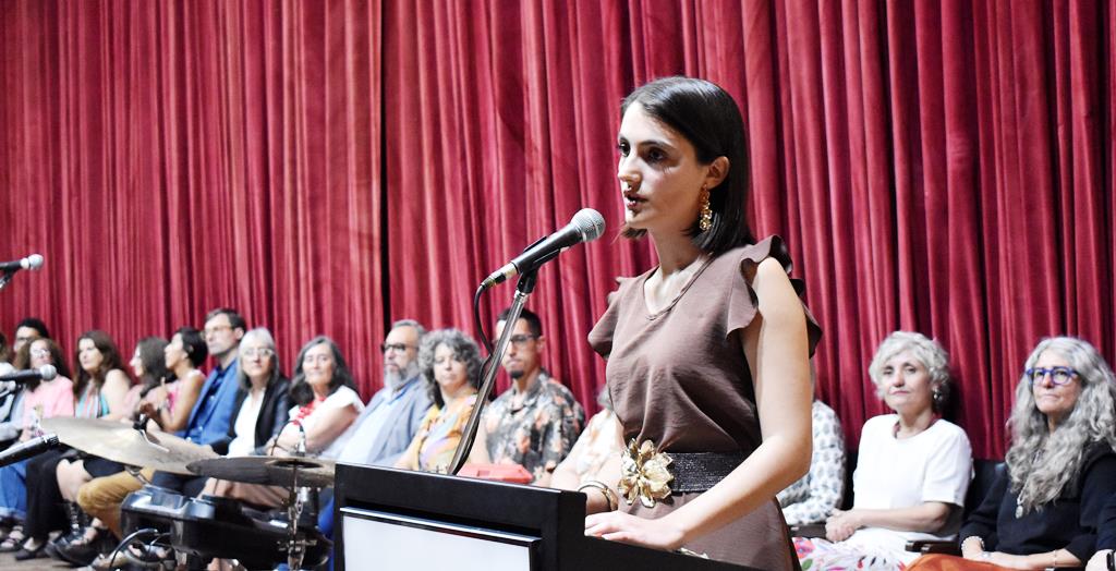 En la misma sintonía se expresó Caterina Reschinga Mesiano, quien recibió su diploma de Correctora Literaria pero que además es estudiante de la Licenciatura en Letras Modernas: “Muchas de nosotras somos la primera o segunda generación universitaria de nuestras familias, muchas de nosotras trabajamos a la par de nuestros estudios, muchas de nosotras vivimos en el interior de la provincia, pero a pesar de todas estas dificultades, hoy estamos acá, celebrando juntos y juntas este logro compartido. Las 120 egresadas que nos encontramos hoy acá somos la prueba de que toda esta lucha vale la pena, de que todo el esfuerzo y las medidas tomadas en defensa de la universidad pública y gratuita dan los frutos esperados y merecidos”. El femenino que atravesó su discurso tenía una dimensión política, porque como ella dijo –recuperando lo que se dice en muchas feministas-, “lo personal es político”. “Este mensaje tiene múltiples interpretaciones; a mí me gusta pensar que indica que todos nuestros espacios sociales son lugares donde podemos plantar nuestra propia voz, porque como estudiantes, y como mujeres, en mi caso y en el de muchas compañeras en esta sala, alzar nuestra voz es político. Tener una voz es un acto político. Esta universidad es un espacio que nos permite y nos invita a levantar nuestras voces y no quedarnos calladas. Alzar nuestra voz implica no solo poner el cuerpo en la calle, en las marchas, sino también producir conocimiento y compartirlo. Democratizar el saber es una manera de acercarnos entre nosotras no solo dentro de la academia, sino también en la escena pública. Hoy cerramos una etapa, pero abrimos las puertas a muchas otras, donde nuestras voces se hagan oír y podamos volver a nuestra casa de estudios cuando queramos y cuando lo necesitemos, pero sobre todo, cuando la Universidad nos necesite a nosotras”.