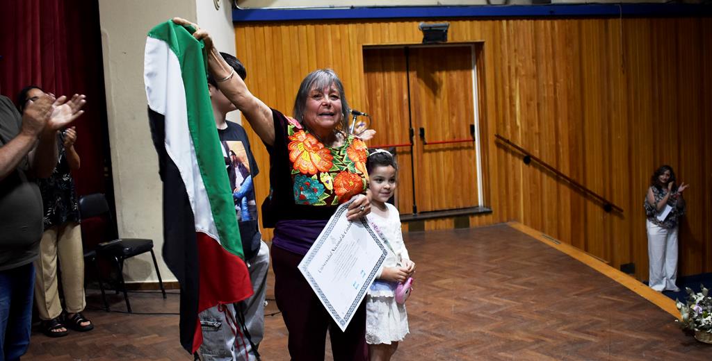 Previo al momento más esperado por egresadxs, familiares y seres queridos, que es la entrega de las acreditaciones de sus respectivas formaciones de grado, posgrado y pregrado, la Decana tomó el juramento a lxs presentes, que en forma personal o muchas veces acompañadxs por docentes de la FFyH, subieron al escenario a recibir el diploma que acredita el logro alcanzado. Aunque cada experiencia es única, el momento mas emotivo llegó cuando el profesor José María Bompadre entregó el título de Licenciada en Antropología a Irene González Quintana, mamá de Fausto Martin, querido egresado de la Escuela de Historia y militante político fallecido en marzo de 2024. De la mano de sus nietos, agradeció al público que la aplaudió de pie y al grito de Viva la Universidad Pública y Viva Palestina, agitó la bandera de este pueblo que es víctima de un genocidio por parte del Estado de Israel en la Franja de Gaza.